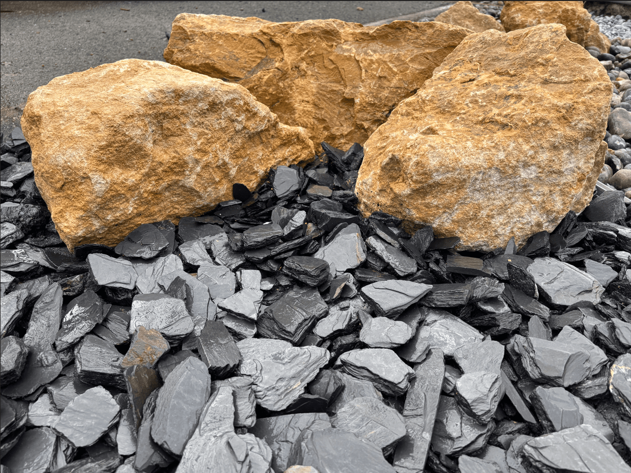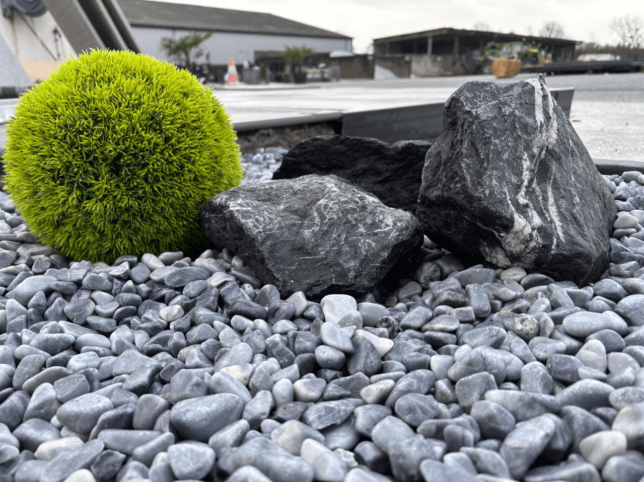 L’ardoise noire concassée 30/70 crée un contraste élégant et graphique. Ce pack gravier jardin livré s’intègre parfaitement aux architectures modernes.