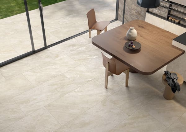 La Dalle Céramique QUARTZ ESSENCE – Nest s’inspire de la roche naturelle, avec ses lignes douces et irrégulières, typiques de l’ardoise ou du quartzite. Sa couleur beige sable, rehaussée de discrètes veines plus claires, capte délicatement la lumière. Elle agrandit visuellement l’espace tout en apportant une atmosphère chaleureuse.