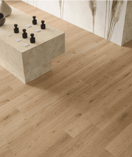 Sa teinte est un blond doré profond, enrichi de veinages et nœuds très réalistes. Cette couleur s’adapte aussi bien aux aménagements modernes qu’aux styles plus rustiques.