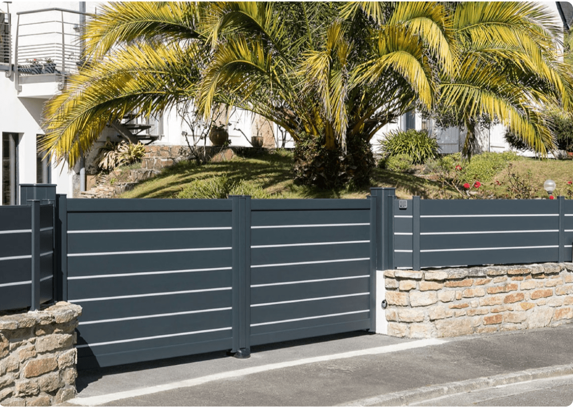 Avec ses lames horizontales pleines, le Portail Battants Aluminium – MARSEILLE propose une esthétique sobre et élégante. Il assure une occultation totale, protégeant ainsi votre intimité. Sa structure en aluminium thermolaqué est disponible dans plusieurs teintes pour s’adapter à toutes les façades et clôtures assorties. Ce modèle est conçu pour offrir un rendu visuel haut de gamme.